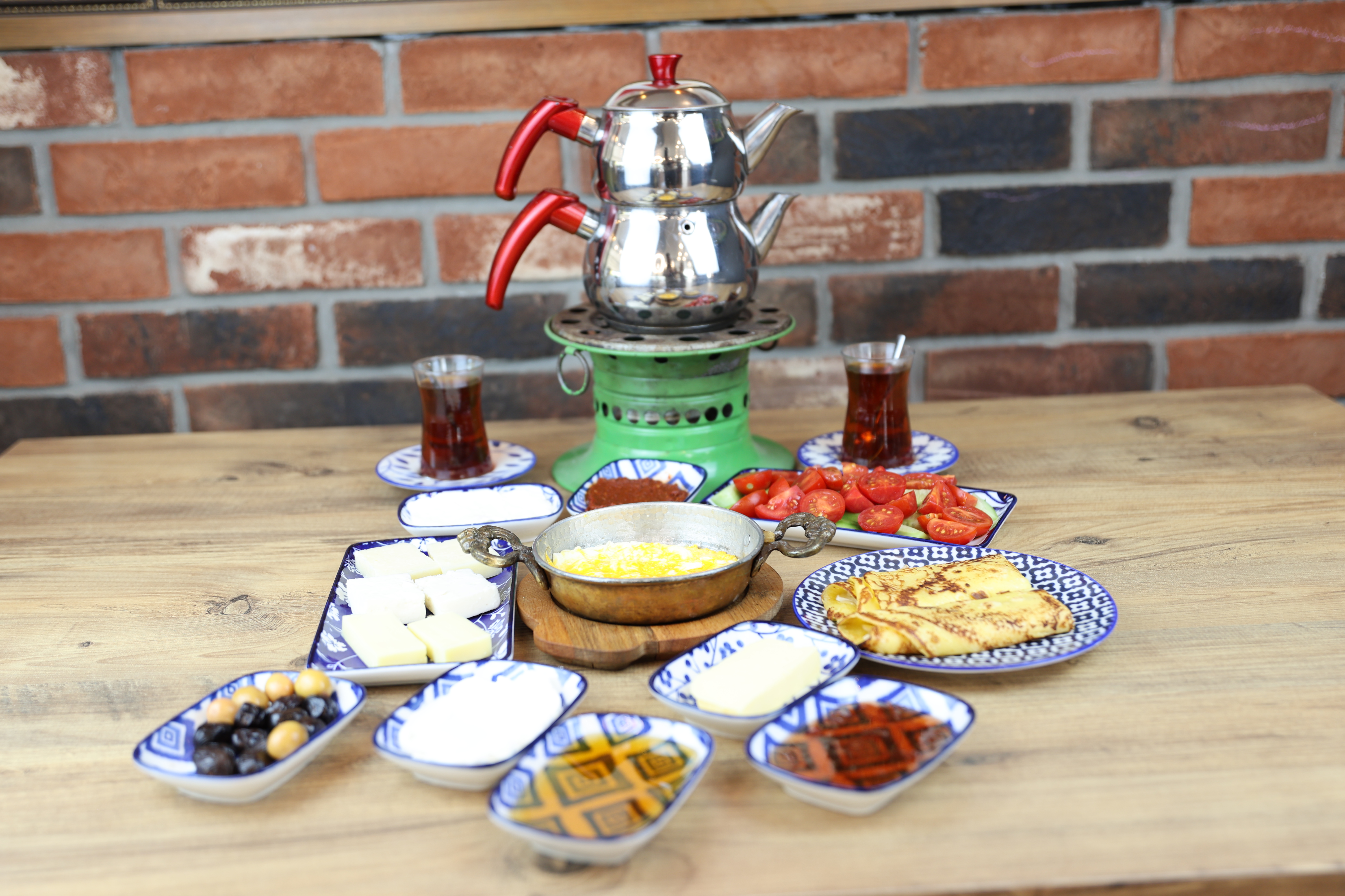 Haşlanmış yumurta, peynir, zeytin, tereyağı, bal, reçel, kaymak, domates, salatalık, çay